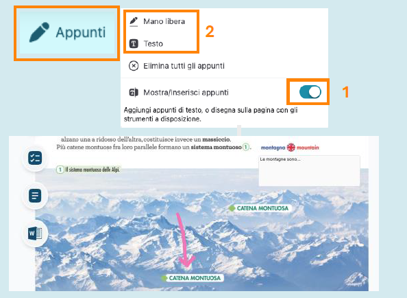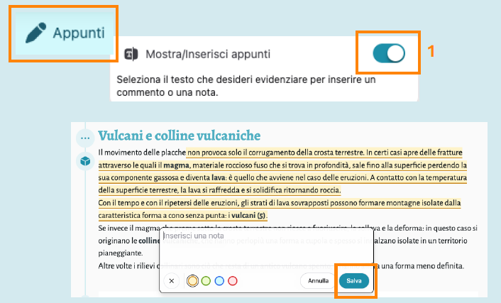 Nel libro digitale è possibile prendere appunti. Cliccando sull'icona "appunti", si apre un menu che offre due modalità per la creazione di note [2 - Vedi immagine]: a mano libera o tramite digitazione (campo testo). La modalità a mano libera permette di evidenziare e sottolineare.