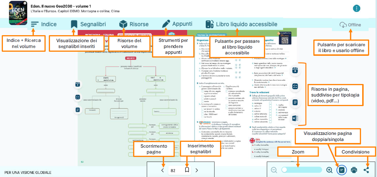 Di seguito è riportato l'elenco delle funzionalità presenti all'interno del nostro Libro digitale, organizzate per area di visualizzazione:
