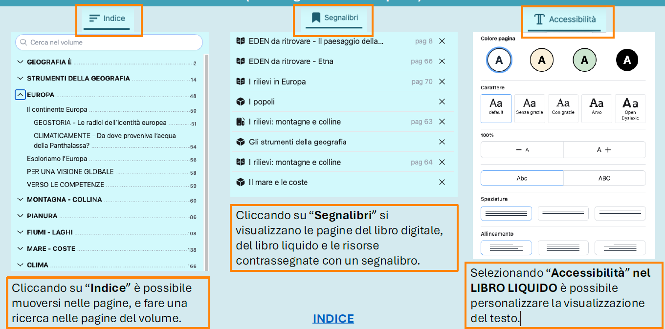 In questa infografica a destra il pannello attivabile dal comando "Accessibilità", presente solo all'interno del Libro liquido accessibile.