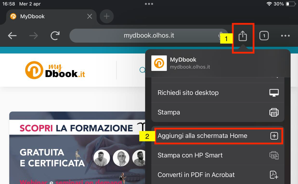 Vai su Safari e digita l'indirizzo www.mydbook.it. Accanto alla barra dell'indirizzo clicca sul simbolo della condivisione (il quadrato con la freccina). Nel menu che si apre seleziona "Aggiungi alla schermata Home". Controlla che il nome della app ...